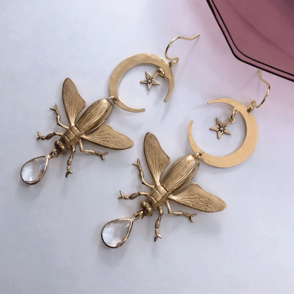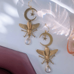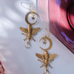 Statement Insect Earrings | Magical Moth Design | Brass Summer Dangles | Crescent Moon, Star, and Clear Crystal